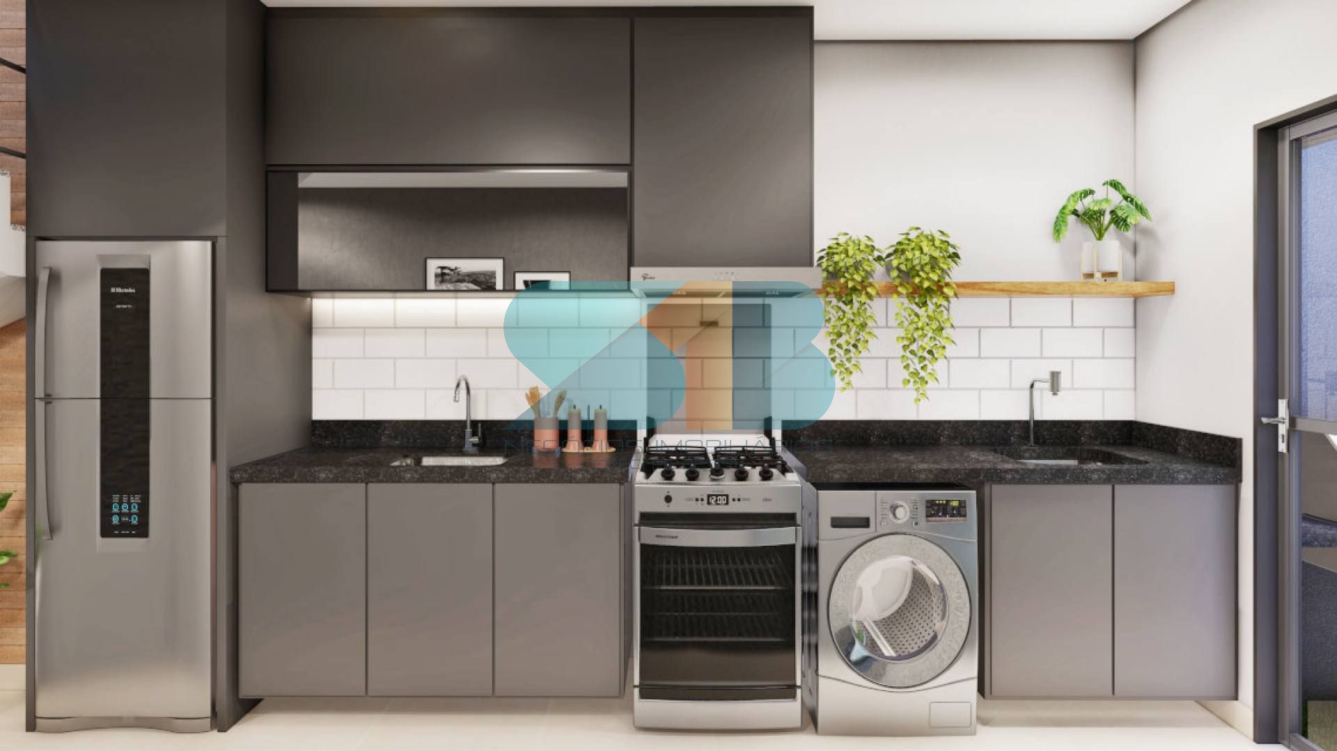 A praticidade diária é garantida por uma cozinha funcional e uma área de serviço otimizada. Complementando o andar térreo, um Banheiro Social elegante serve perfeitamente às suas visitas, mantendo a ala íntima da casa totalmente reservada.