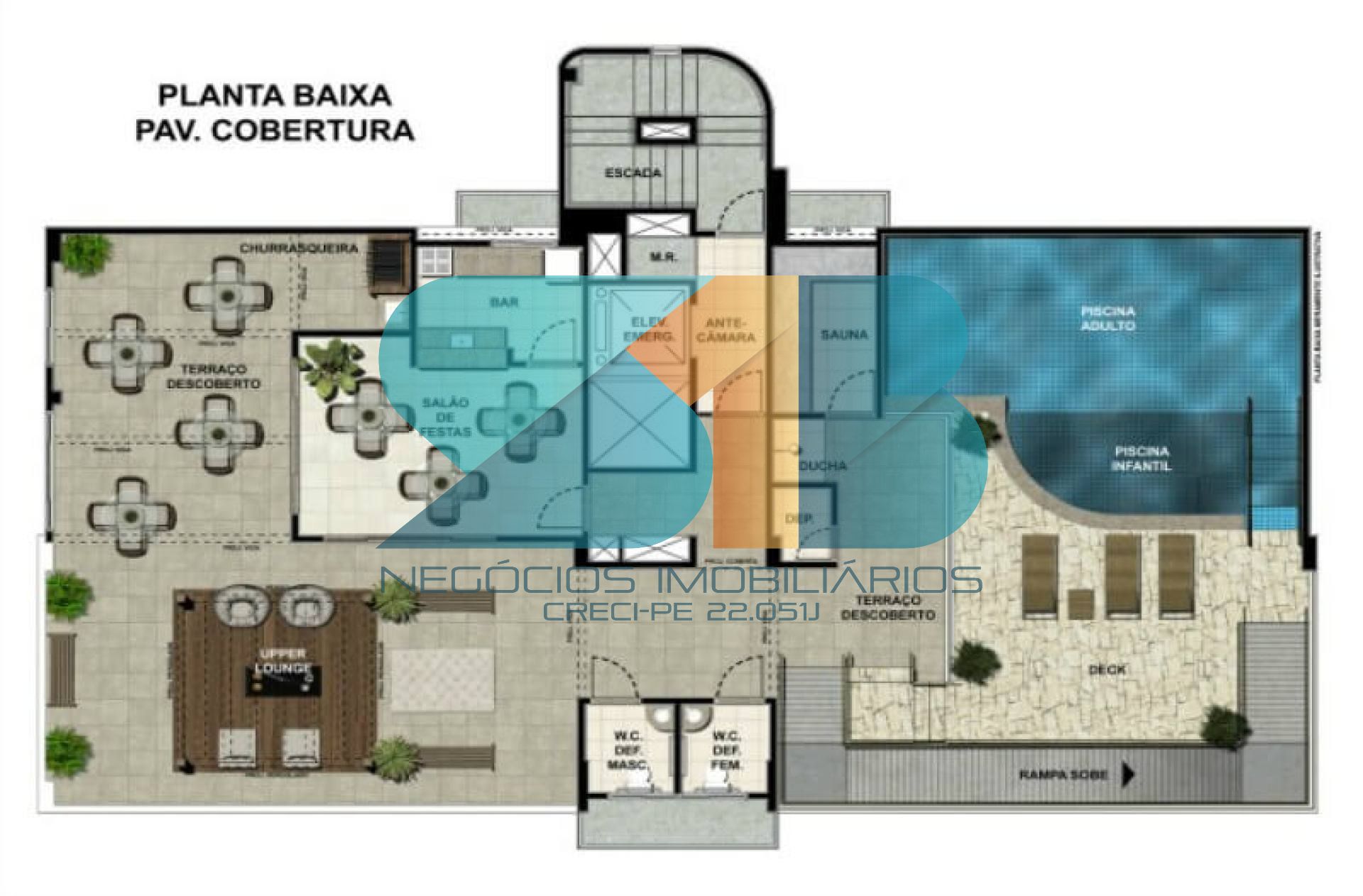 Piscina Adulto e Infantil com deck e área de contemplação.